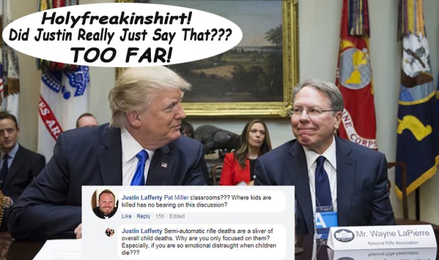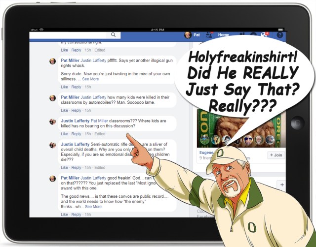 Pat Miller to Justin Lafferty how many kids were killed in their classrooms by automobiles?? Man. Soooooo lame.