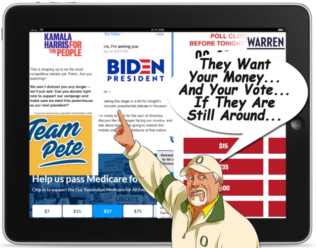 The desperation for relevance, by almost all of the “front-runners” and a handful of those who don’t have a chance in hell, but won’t give up, was clear by the plethora of emails I got, before, DURING and after the debate. During? Yep…no more than three “how am I doing, please donate!” emails while the debate was going on. Take away their phones?