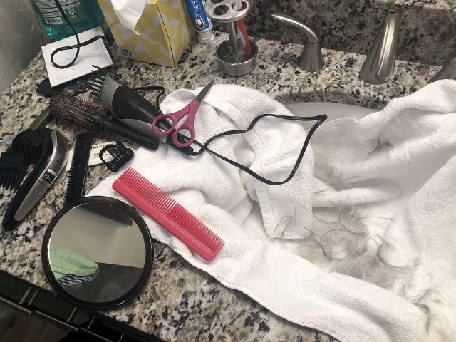 Well…it isn’t hard at all. If you don’t mind how the hell you look. Which these days, mostly I don’t. I used an old (very old) set of hair clippers…my beard trimmer…and the more traditional way of cutting/tapering, using a comb and scissors. Unfortunatetly, the only scissors we have, are “Kid Scissors” you can get in 5-packs at the dollar store. REAL hair scissors are expensive. But, I am going to assume they are worth it.