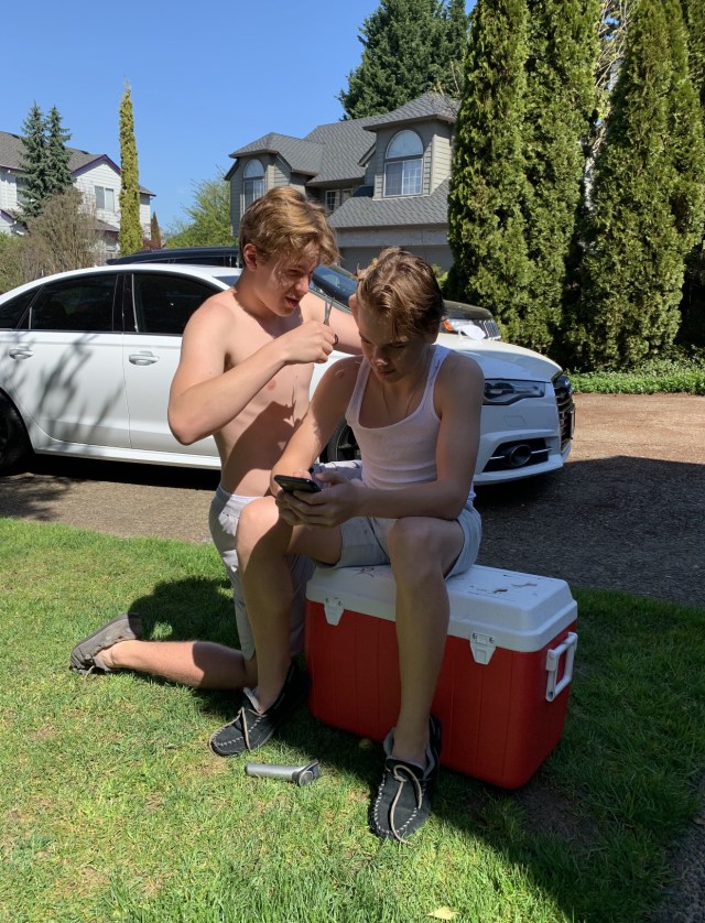 It’s far more serious when you are a teenager, and your “style” is one of your most guarded and recognizable assets! So, imagine how desperate my oldest grandsons, Andrew (with the shears) and Zach (trusting his brother more than I would have) actually allowed one another to cut each other’s hair. Brotherly love, or sheer desperation. Hard to say. But, they did it!