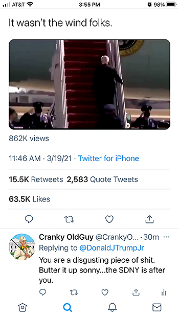 OK. Yes. I admit it. I am having a hard time stopping, now that DJTJ has taken over the tweeting. Because DJTJ is an asshole…all of Dad’s worst characteristics, without a smidgen of charm.
