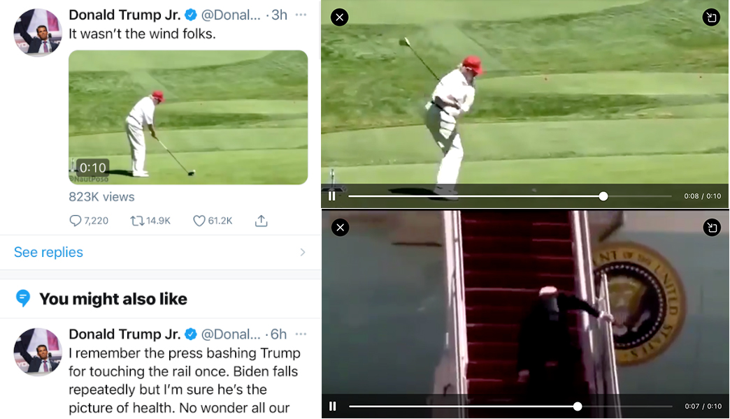 Like a tweet this week of an edited video that shows Donny hitting a drive (could be almost any day since before or after he left office), and hitting Joe Biden, knocking him off of the stairs on AirForce One.