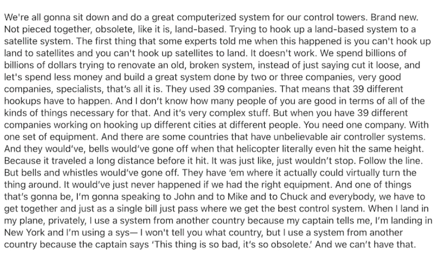 These are Donny’s words, from a recent speech about revamping the FAA technology for control towers, after two horrendous crashes in a week…verbatim.