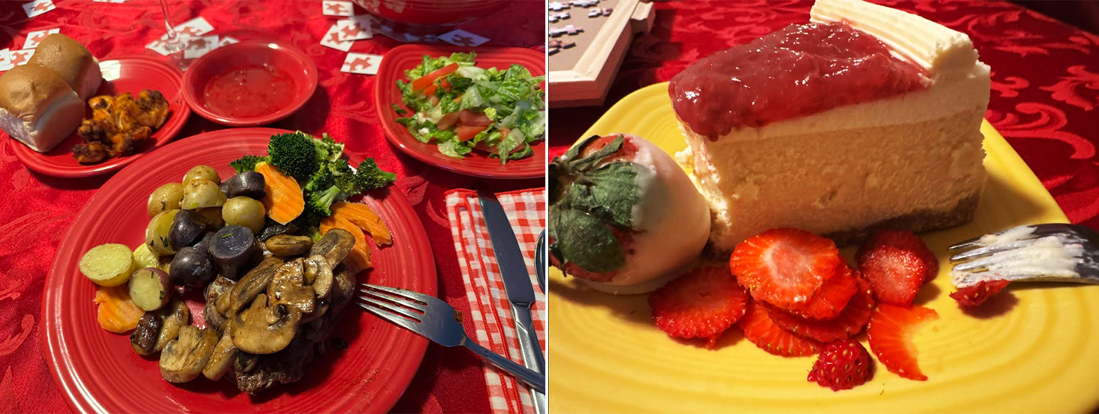 I made her favorite drink, the “lemon drop” (a couple of them to make sure she was happy). Then finished the meal with a special strawberry cheesecake from our favorite bakery. All good. and all special, because it required forethought.