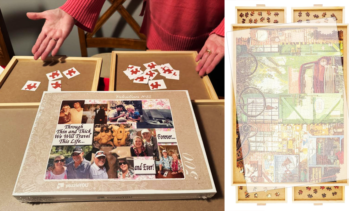 The second part of the gift was a “puzzle table” I bought on Amazon, that has sorting drawers, a swivel base, and a cover to keep the puzzle safe from pets, kids, or other mishaps when you are working on it.