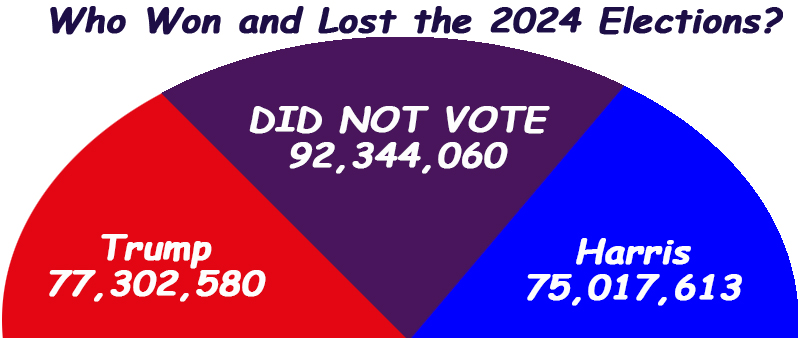 Breaking that down even further to “the majority,” in the 2024 Election, Trump had 77,302,580 votes, to Harris who had 75,017,613. So…THE NON-VOTE “outvoted” both parties.