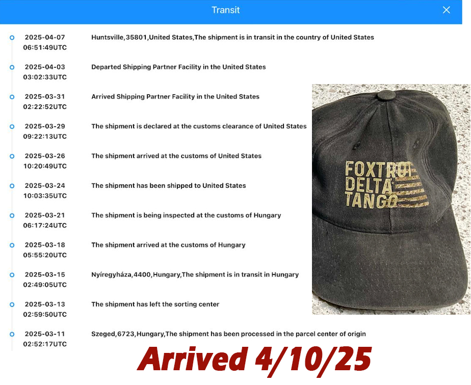 The tracking info for the FIRST hat, showed that it had reached customs in…HUNGARY. Wait. This hat was made in China, but was being shipped through Hungary?